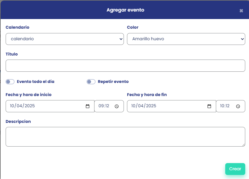 Como ya mencionado antes se pueden crear eventos, para hacerlo basta con clicar el día en el que queremos que suceda el evento y nos aparecerá la siguiente pantalla: