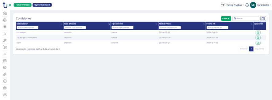 Aquí nos aparecerá un listado con las tablas de comisiones que tenemos creadas, para crear una nueva clicaremos en “ Crear+”.