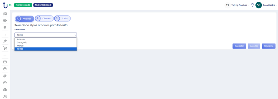 Seguidamente nos aparecerá la siguiente ventana, clicaremos en la pestaña desplegable, y seleccionaremos si queremos aplicar la tarifa a Un articulo, una categoría , una marca o a todos. A continuación clicaremos en “Siguiente”.