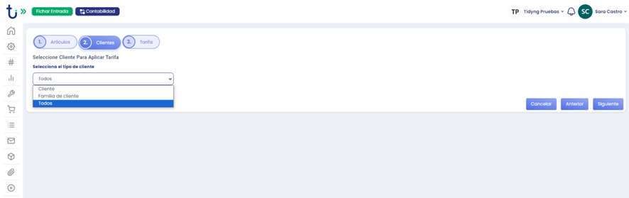 A continuación nos aparecerá la siguiente ventana, clicaremos en la pestaña desplegable, y seleccionaremos a qué tipo de cliente aplicaremos esta tarifa : Clliente, Familia de clientes, o a todos. A continuación clicaremos en “Siguiente”.