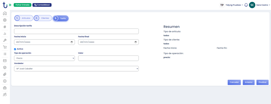 Nos aparecerá la siguiente ventana, donde Rellenaremos el nombre de la tarifa, La fecha de inicio, y la fecha fin que se aplicará, si esta activa o no, y el tipo de operación que va a tener ( Precio, Porcentaje, escalados por precio, Escalados por cantidad)*