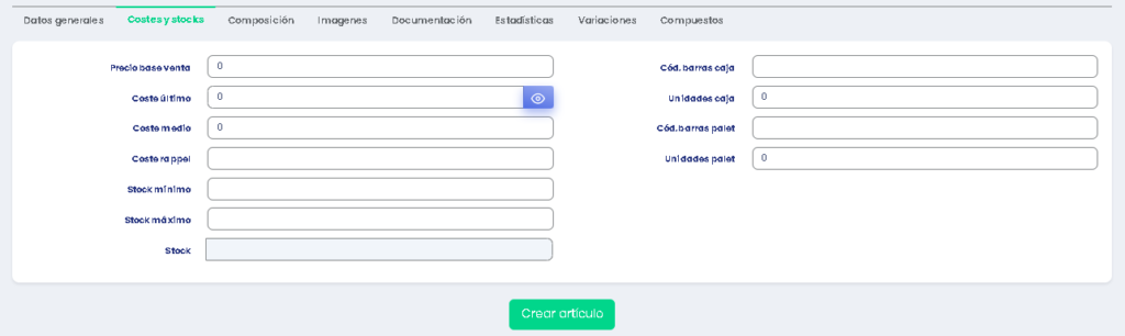 En este apartado deberemos introducir todos los datos sobre nuestro stock de este producto y los costes del mismo.