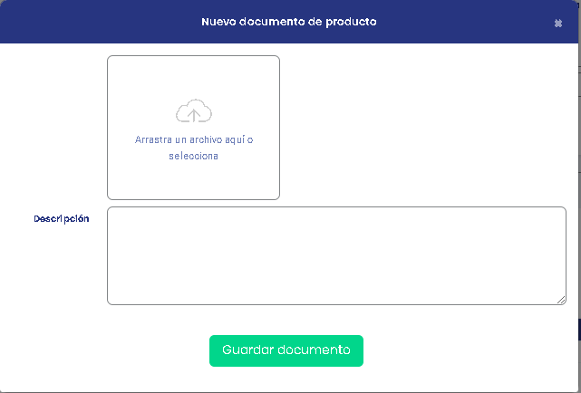 En esta opción podemos agregar al producto los documentos que veamos pertinentes. Al pulsar en «Nuevo documento» nos aparecerá una ventana en la que podremos agregar el archivo que necesitemos y añadirle una descripción.