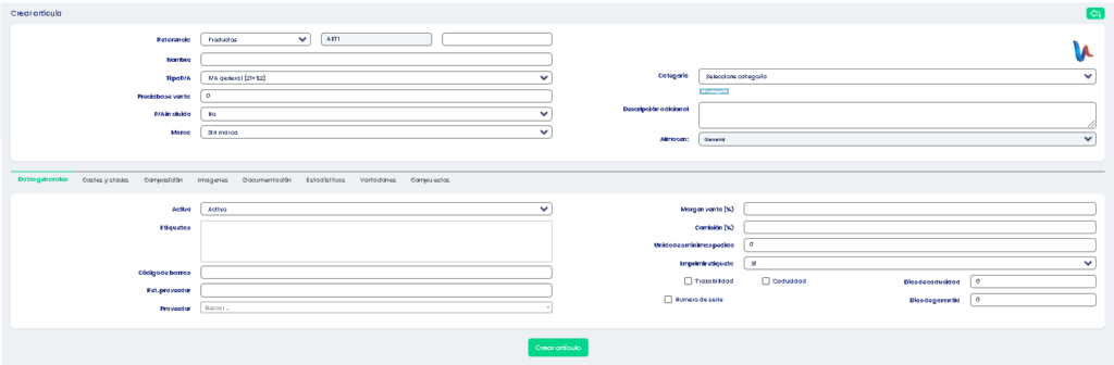 Al pulsar en «Crear artículo» nos abrirá un formulario en el que deberemos agregar la información necesaria. Recordamos que los tipos de IVA, las Marcas, proveedores y las categorías se configuran a parte. Además hay que tener en cuenta que los almacenes sólo se podrán cambiar al editar el producto.