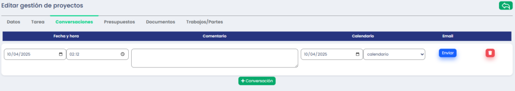 Esta sección permite registrar comunicaciones relacionadas con el proyecto, ya sean internas o con el cliente.