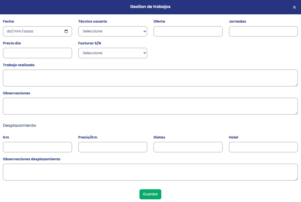 Desplazamiento: Incluye datos de dietas, transporte o alojamiento asociados al trabajo.
