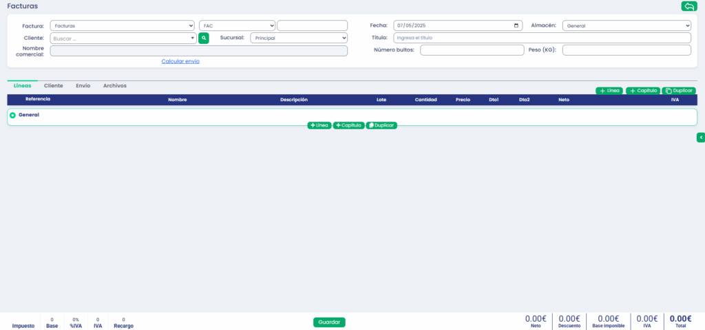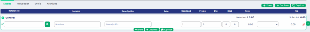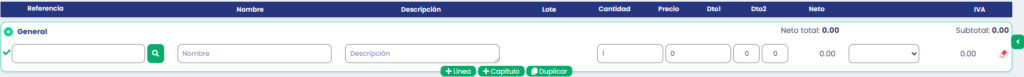 Para añadir un producto, debemos hacer clic en «+ Línea», lo que nos mostrará lo siguiente: