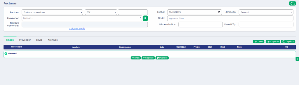 En esta pantalla, será obligatorio seleccionar un proveedor y un producto, pero también podremos cambiar la fecha, ingresar el número de factura, un título, y los detalles de bultos y peso en KG.