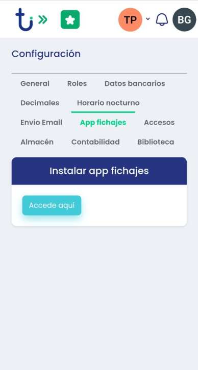 Descargar la aplicación: Para descargar la aplicación de fichajes, hemos de acceder al programa desde un móvil. Accedemos al apartado Configuraciones>App fichajes, tenemos un botón llamado “Accede aquí” que al pulsarlo nos instala la aplicación.
