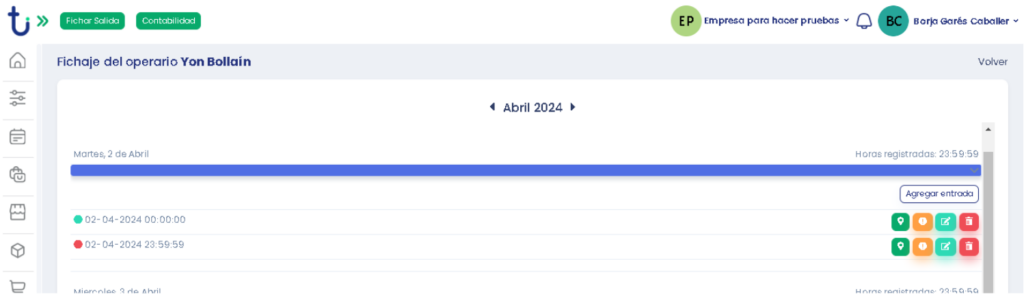 Al pulsar en esta opción nos saldrán gráficos en los cuales se nos indicarán las horas hechas por el trabajador por cada día. Si pulsamos en uno de los días nos saldrá un histórico con las entradas y salidas fichadas ese mismo día. Y un botón con el que podremos agregar una entrada y salida manualmente