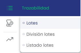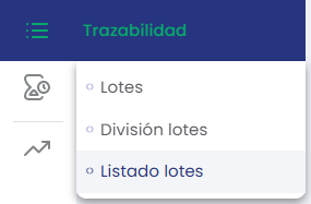 El listado de lotes es un apartado en el que podremos consultar el listado de lotes que hay de un producto en específico. Para hacer esta consulta debemos acceder al menú lateral izquierdo, vamos a Trazabilidad>Listado de Lotes.