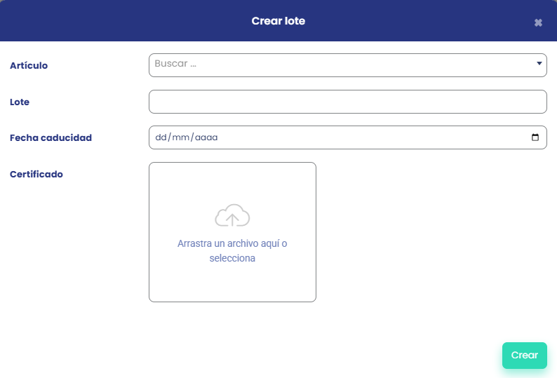 Se nos abrirá una pestaña, seleccionaremos el artículo, escribiremos un código para el lote y añadiremos una fecha de caducidad.