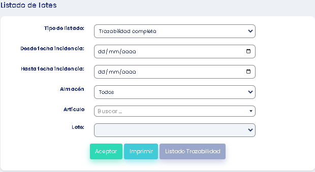 Se nos abrirá un formulario en el que deberemos seleccionar el tipo de listado, una fecha de incidencia inicial y una final; el almacén y el producto. Si es necesario podemos especificar el lote exacto. Una vez lleno pulsaremos en «Aceptar».
