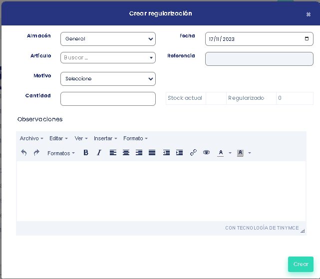 Se abrirá un formulario en el que seleccionaremos el almacén, el artículo y la fecha. Además especificaremos la cantidad y, si es necesario añadiremos unas observaciones.